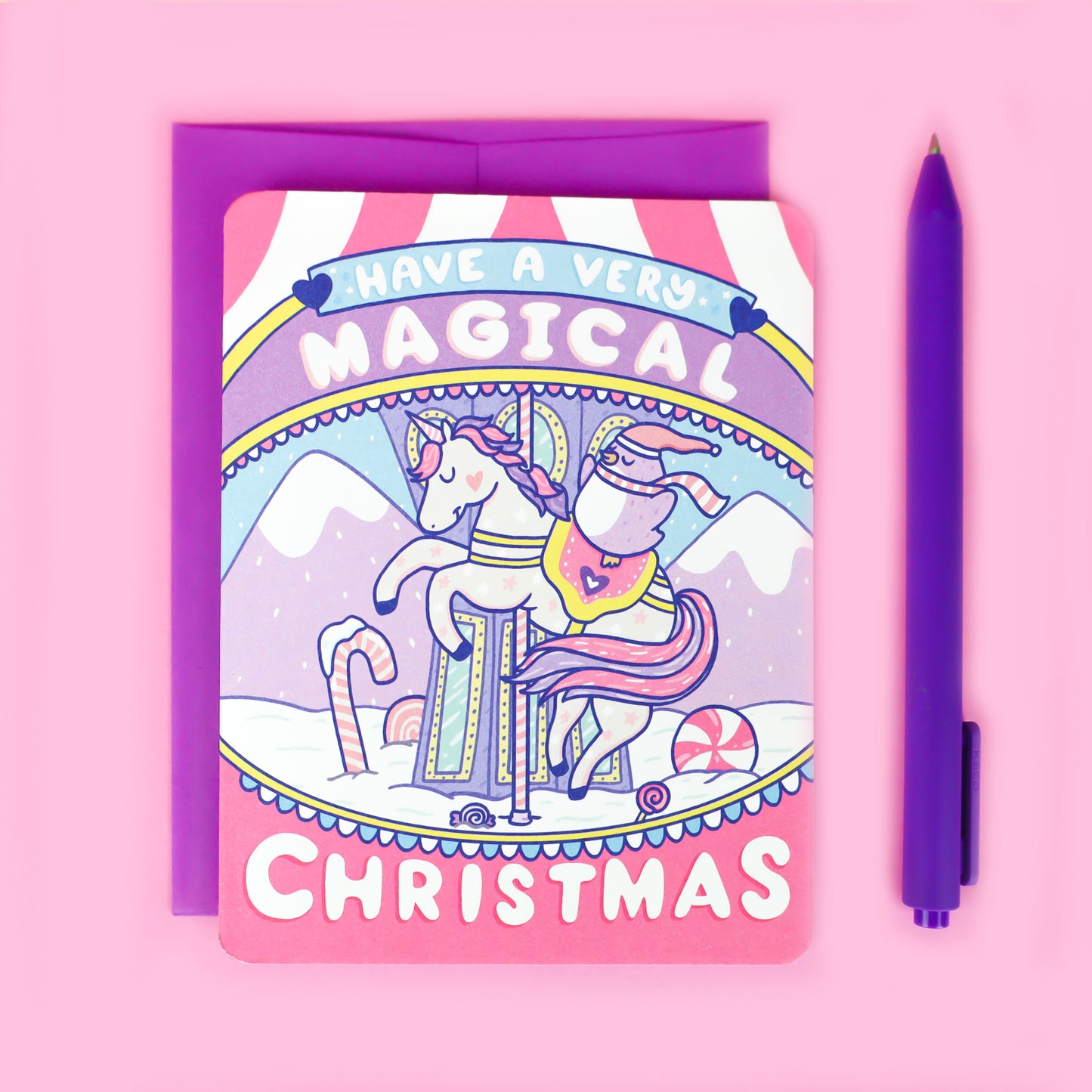 Magical-Christmas-Card-Pastel-Unicorn-Pink-Purple-Merry-Go-Round-Winter-Wonderland-Holiday-Carnival-Card-for-Kids-Children-Turtles-Soup