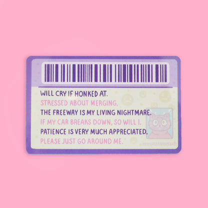 Operating a motor vehicle can be scary. With your very own nervous driver's license, you can let people know to be gentle with you on the road. Please take a deep breath. It's going to be okay!