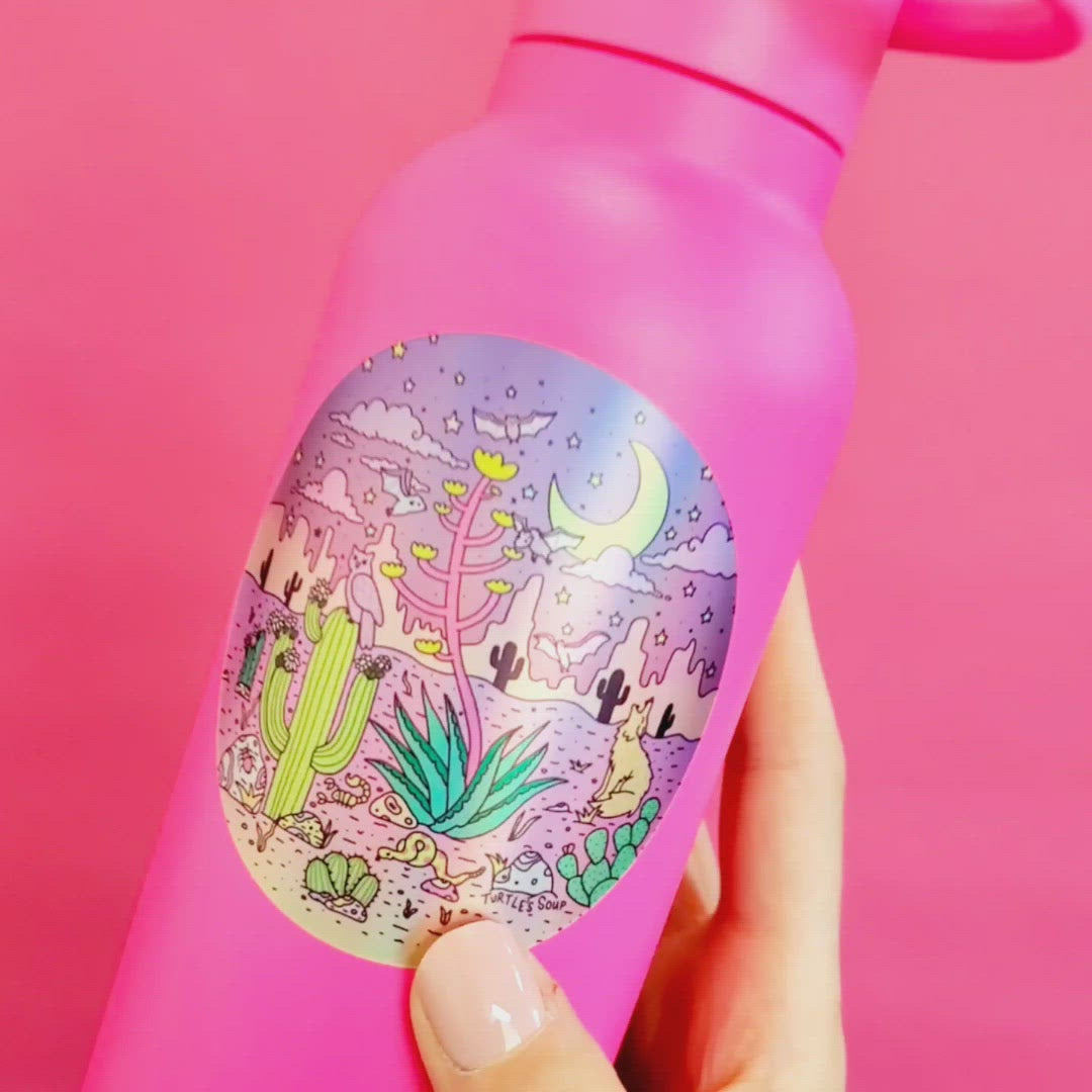 See the pink and purple desert gleam and shine with this metallic sticker! Desert nights are always filled with some much activity and energy. Bats, tarantulas, snakes, owls, and coyotes are all hanging out, looking for food, and enjoying the dazzling, starry sky. It all feels like a wonderful desert dream.