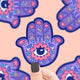 A hand shaped sticker with an eye in the palm, decorated with color and smile faces