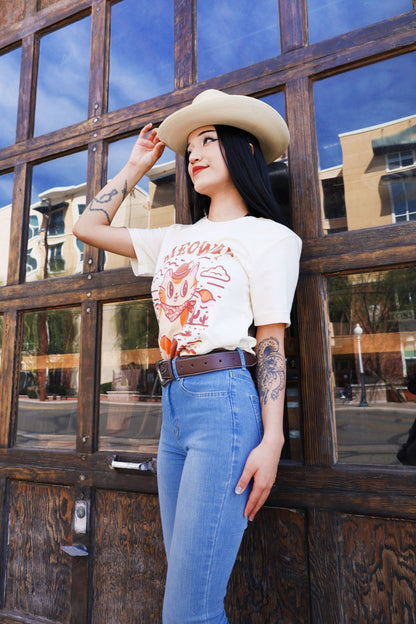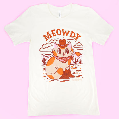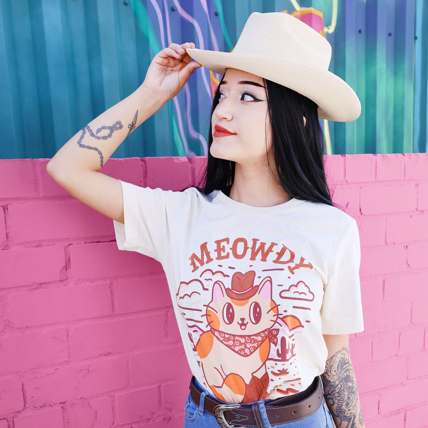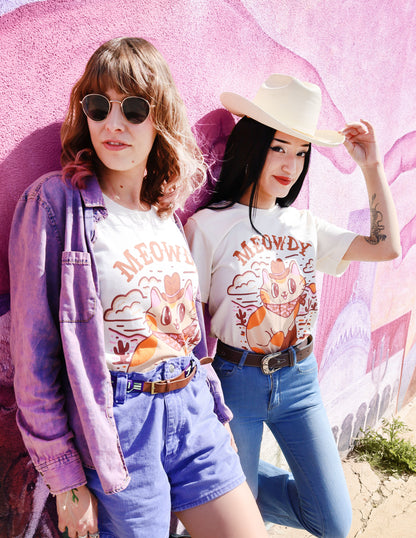 Meowdy partner! This tee is screen printed locally in Tucson, Arizona, and is super soft and lightweight. Made with 100% cotton, each shirt includes a matching 'Meowdy' vinyl sticker to go with it!