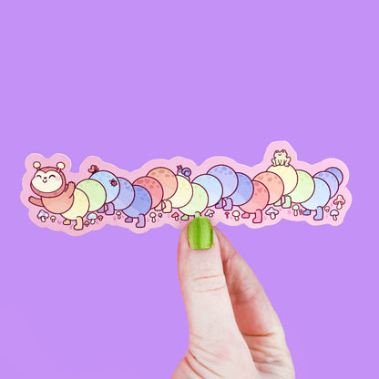 Long Bookmark shaped like a caterpillar that has rainbow colors and tiny bugs