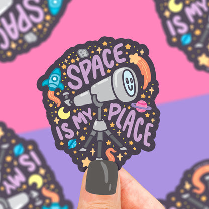 vinyl sticker of a telescope, space is my place, with stars and planets!